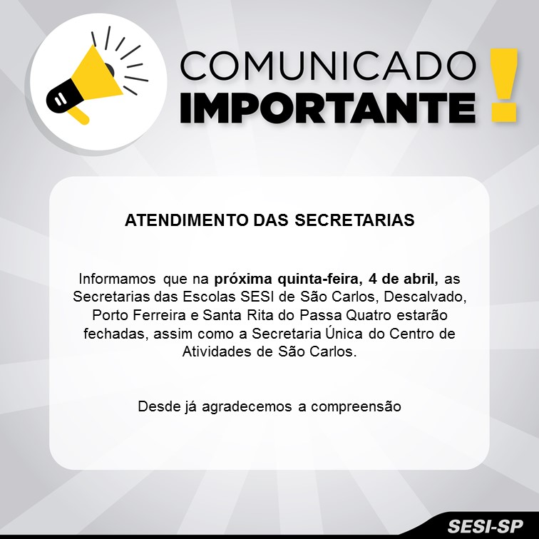 As Secretarias das Escolas SESI de São Carlos, Descalvado, Porto Ferreira e Santa Rita do Passa Quatro estarão fechadas, assim como a Secretaria Única do Centro de Atividades de São Carlos
