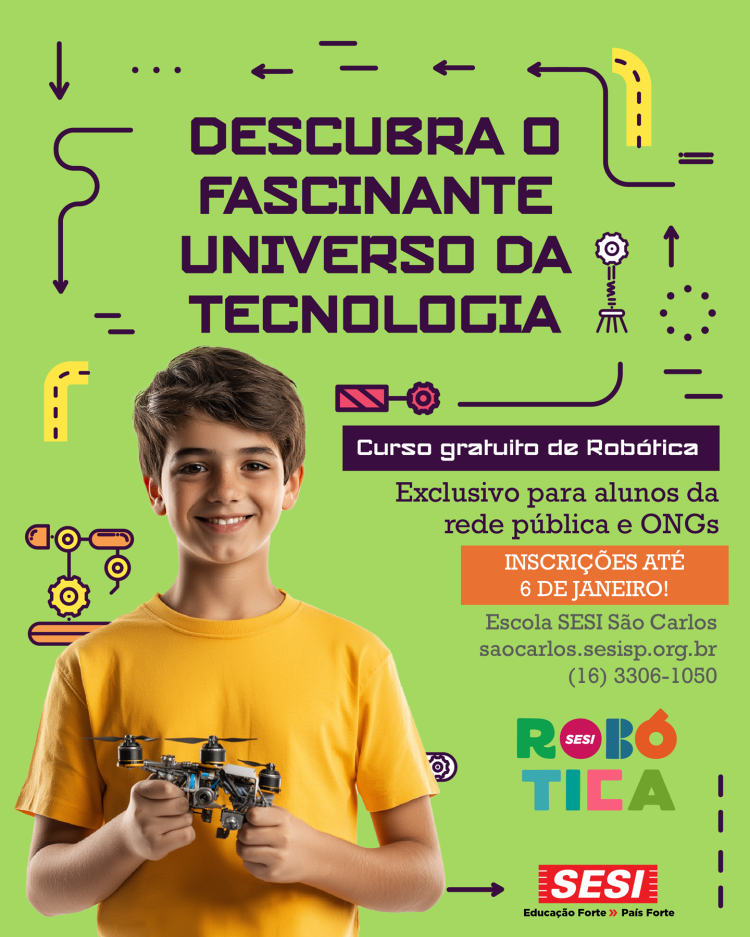 A Escola Sesi de São Carlos está com inscrições abertas para novas turmas do curso gratuito de programação e robótica, voltado exclusivamente para alunos matriculados nas redes públicas de ensino e de Organizações não Governamentais (ONGs).