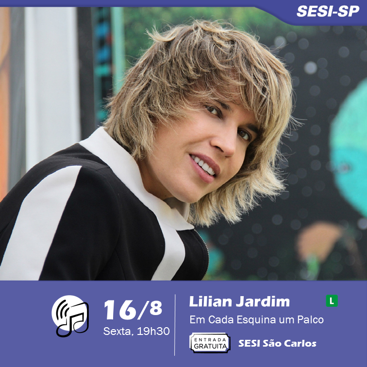 A cantora Lilian Jardim sobe ao palco do SESI São Carlos para cantar as canções inéditas do disco Em Cada Esquina Um Palco. O show acontece no dia 16 de agosto, sexta, às 19h30. Os ingressos gratuitos podem ser reservados pelo sistema Meu SESI, no site www.sesisp.org.br/meu-sesi.